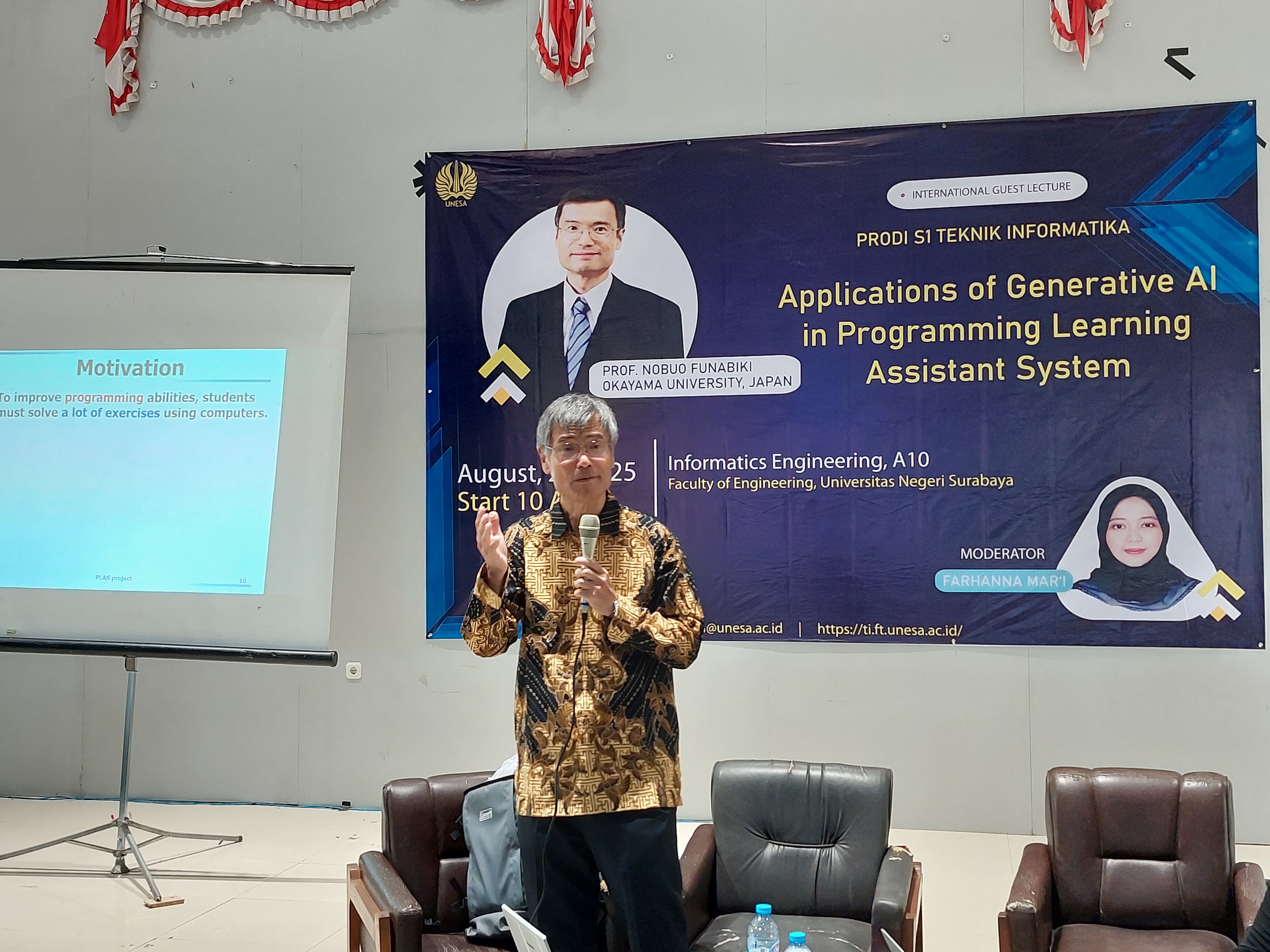 Program Studi S1 Teknik Informatika Universitas Negeri Surabaya (UNESA) menggelar kuliah tamu internasional bertajuk “Applications of Generative AI in Programming Learning Assistant System” pada Rabu, 27 Agustus 2025, bertempat di Auditorium Lantai 4 Gedung A10. Kuliah tamu ini menghadirkan Prof. Nobuo Funabiki dari Okayama University, Japan, dengan Farhanna Mar’i sebagai moderator.